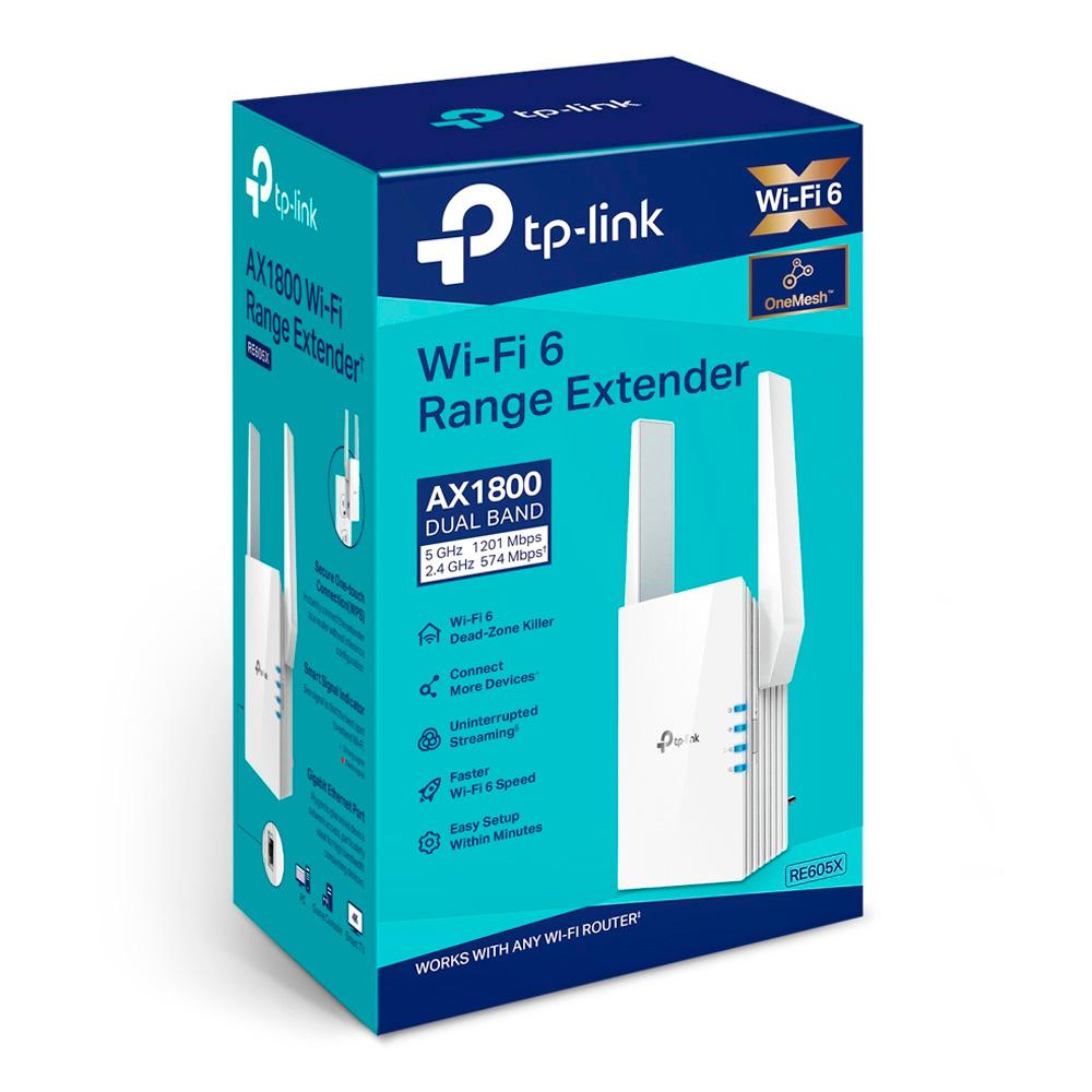 Extensor AX1800 de doble banda Wi-Fi 6, 574 Mbps en 2.4 GHz + 1201 Mbps en 5 GHz, 2 antenas externas, 1 puerto Gigabit, CPU Broadcom Quad-Core de 1.5GHz, 1024 QAM, Enchufe directo a pared, Tether App, WPS, indicador de señal inteligente, Horarios de encendido / Apagado, Luz LED, modo RE/AP, OneMesh, Beamforming, MU-MIMO, OFDMA